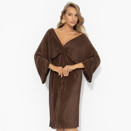 Тихий джаз, мягкий свет и лёгкий аромат ванили в воздухе. Платье в оттенке молочного шоколада будто сошло с вечеринок 20-х – расслабленный крой, струящаяся ткань и глубокое декольте создают томный, женственный силуэт. Просто надень и позволь себе быть роскошной без слов. Платье со свободными акцентными рукавами. Степень оголения ключиц можно регулировать.