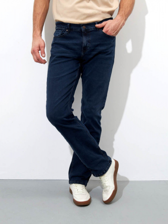 Мужские классические джинсы с пятью карманами. Посадка Slim fit (облегающие по бедру), средняя высота талии. Застежка на молнии. Немного зауженные к низу. Выполнены из эластичной ткани denim stretch, цвет ткани Blue/Black(лицевая сторона ткани темно-синяя, изнаночная сторона- черная). Темная стирка "stone wash" со слабовыраженными потертостями и "усами" спереди и потёртостями сзади.