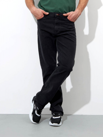 Мужские модные джинсы с пятью карманами. Посадка Regular fit (полуоблегающие по бедру), высокая талия. Застежка на молнии. Выполнены из слабоэластичной ткани denim comfort stretch, цвет ткани Black/Black (лицевая и изнаночная стороны ткани черные). Темная стирка с потёртостями только по швам.