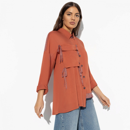 Рубашка «Пик актуальности» — это сочетание благородного медного цвета и современного дизайна, доступное для оптовых покупателей. Изготовленная из 80% вискозы и 20% полиэстера, она выполнена из плательной ткани «штапель-твил» и «шифон», что обеспечивает высокое качество и комфорт при носке.