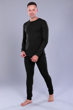 Нательное белье с фуфайкой и кальсонами. Горловина фуфайки с отделкой обтачка, рукава с манжетами. Кальсоны на резинке с ластовицей и манжетами внизу.