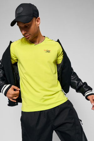 Мужская футболка в ярких расцветках с рукавом - регланом и фирменным логотипом на плечах. Воротник V-образный, двойной. На груди и сзади небольшая печать.
