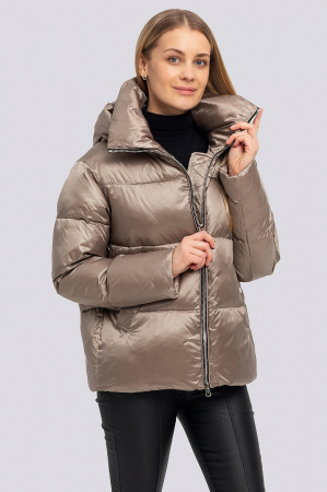 Женская короткая куртка из мягкой ткани с благородным блеском со съёмным капюшоном. Центральная застежка на металлическую молнию. В рукавах трикотажные манжеты. Утеплитель синтепух-синтетический пух, плотность 180, температурный режим до -10.