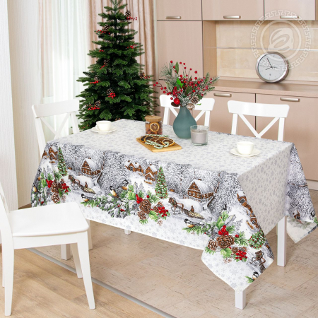 «Однажды в студеную зимнюю пору», – при взгляде на новогодние скатерти из рогожки вспоминается строка стихотворения Н.Некрасова. Перед нами деревенский пейзаж с маленькими и уютными улочками, большими сугробами, нарядной ёлочкой и деревянными избами. Любуешься авторским рисунком и как будто чувствуешь и легкий морозец, и хруст снега. Это чудесный акцент в интерьере кухни, который дарит чувство праздника и приятной ностальгии.