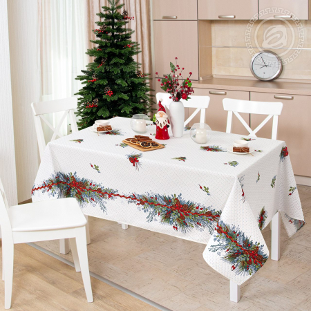 «Антураж» – новогодняя скатерть из рогожки с оригинальными деталями. Композиция включает в себя все праздничные элементы: еловые веточки с красными лентами, шишками и ягодами.