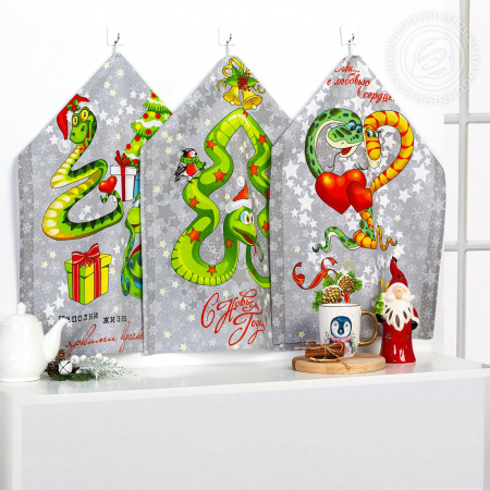 «Маскарад» – новогодние полотенца из рогожки с ярким дизайном. Главные герои здесь веселые змейки, которые украшают дом к счастливому празднику. Они наряжают ёлку, готовят подарки и примеряют образ Деда Мороза. Уникальный рисунок дарит положительные эмоции и приближает ощущение торжества. Приятный сюрприз для родных и друзей.