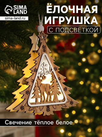 Светящееся деревянное украшение «Ёлочка с оленем» — новогодняя фигурка в скандинавском стиле с тёплым свечением. Игрушка диаметром 11 см полностью готова к празднику — батарейки LR41 уже вложены в комплект.