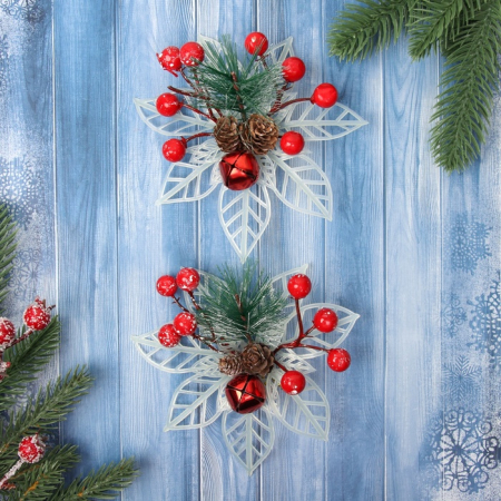 Набор из двух ёлочных украшений в форме резных цветов с ягодами выполнен в скандинавском стиле. Изделия высотой 13 см сочетают прозрачные и красные оттенки, создавая лаконичный и естественный образ для новогоднего декора.