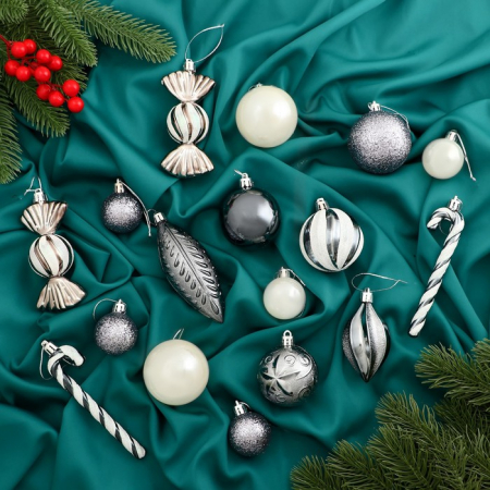 Набор из 40 пластиковых шаров в серебристо-белой гамме создаёт элегантный новогодний декор, сочетающий традиции датского и скандинавского стилей с элементами шебби-шик. Однотонные и украшенные рисунком шары подходят для оформления ёлки и праздничного интерьера.