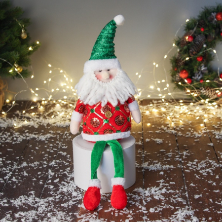 Мягкая новогодняя игрушка в виде Деда Мороза с сияющим костюмом и длинными ногами станет ярким украшением праздничного интерьера или оригинальным подарком к Новому году. Эта фигура выполнена в стиле новогоднего барокко, сочетая богатство деталей и элегантность. Размер — 42 см в высоту и 19 см в ширину, она легко привлекает внимание и создает атмосферу волшебства. Мягконабивное тело с ногами обеспечивает приятные тактильные ощущения и долговечность, а отсутствие подставки позволяет разместить её на любой поверхности. Красно-зеленый костюм с эффектом сияния подчеркивает праздничную тематику и делает образ Деда Мороза особенно выразительным.