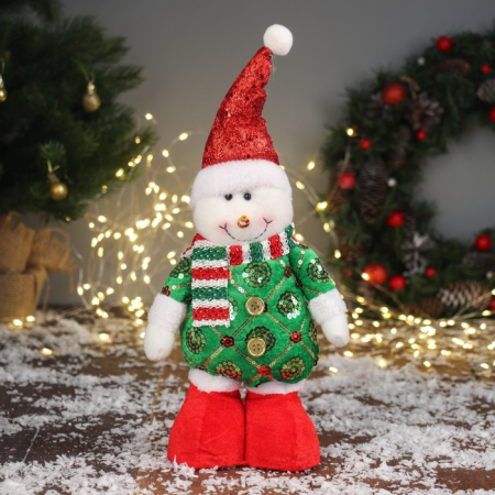 Мягкая новогодняя игрушка в виде снеговика в сияющем костюме станет ярким украшением праздничного интерьера или оригинальным подарком. Эта фигурка выполнена в стиле новогоднего барокко, сочетая красно-зеленые оттенки с изящными деталями. Размер — 34 см в высоту и 17 см в ширину, что делает её заметным элементом декора для дома, елки или зимних мероприятий. Мягкое тело с мягконабивными частями создает приятные тактильные ощущения и обеспечивает долговечность. Наличие ног у снеговика придает ему реалистичный силуэт, а его праздничный костюм подчеркивает новогоднюю тематику. Игрушка не оснащена подставкой и не требует питания, что облегчает её размещение в различных интерьерах.