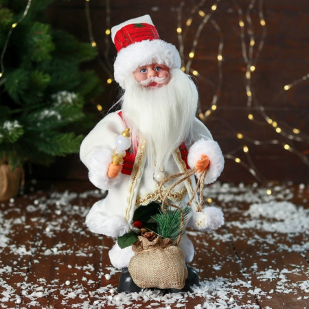 Декоративная фигурка Деда Мороза с мешком подарков и фонариком высотой 31 см станет центральным элементом праздничного оформления для дома или офиса. Этот новогодний сувенир объединяет в себе традиции советского дизайна и современные тенденции фьюжн, дополненные датским и скандинавским минимализмом, а также лёгкими нотками шебби-шику. Красно-белая цветовая гамма подчёркивает классический образ зимнего волшебника, а мягкая подсветка и плавное движение оживляют композицию, создавая ощущение настоящего праздника и уюта.