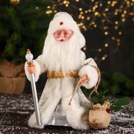 Дедушка Мороз в белой шубке с посохом и мешком станет стильным акцентом вашего праздничного декора. Этот персонаж органично дополнит пространство под ёлкой, на полке или в фотозоне.