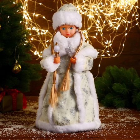 Фигурка Снегурочки высотой 40 см в белой шубке с посошком станет изысканным акцентом новогоднего декора. Работая от батареек, она оживляет праздничную атмосферу плавным движением без необходимости подключения к электросети.