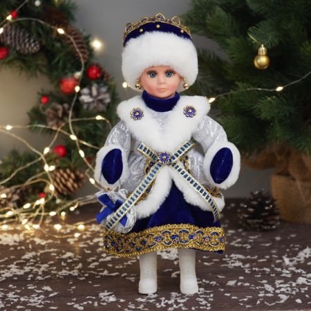 Фигурка Снегурочки высотой 30 см в серебристо-синем наряде с меховым жилетом и изящными брошами представляет собой гармоничное сочетание советских традиций и современного фьюжн-стиля. Эта декоративная кукла станет выразительным акцентом новогоднего интерьера, наполняя пространство атмосферой зимней сказки и праздничного настроения. Отсутствие источника питания упрощает размещение, позволяя использовать украшение в самых разных местах — от домашней ёлки до офисного пространства. Универсальный образ подходит и для детей, и для взрослых, что делает фигурку востребованным элементом сезонного декора и оригинальным подарком.