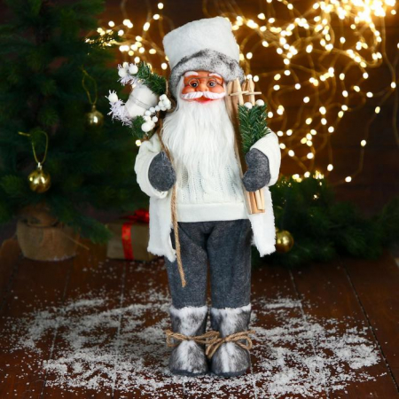 Дед Мороз в белом свитере с лыжами станет стильным акцентом вашего новогоднего декора. Этот персонаж органично дополнит пространство под ёлкой, на каминной полке или в фотозоне.