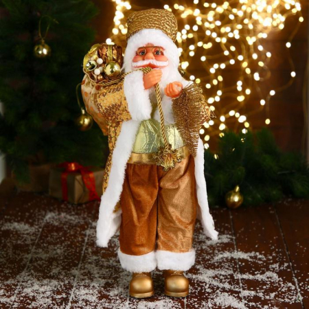 Новогодняя фигурка Деда Мороза высотой 45 см в золотом костюме сочетает в себе черты классики, ар-деко и праздничного барокко, создавая выразительный акцент в праздничном интерьере. Этот декоративный элемент подчёркивает атмосферу зимнего торжества без дополнительного освещения и звуковых эффектов.