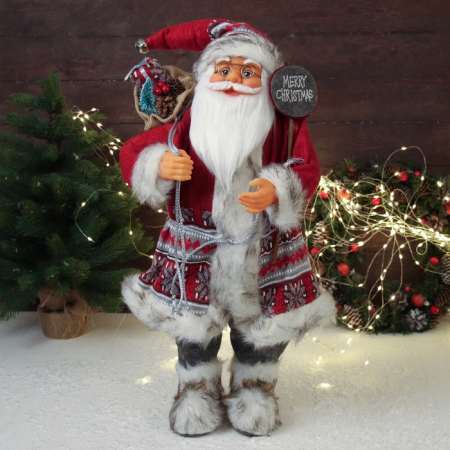 Дед Мороз в красной шубке с орнаментом и подарками станет замечательным акцентом среди праздничного декора. Этот персонаж органично дополнит пространство под ёлкой, на полке или в фотозоне.