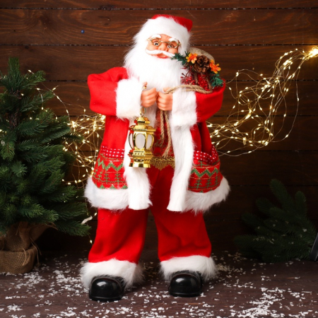 Пригласите в свой дом символ праздника вместе с фигуркой высотой 70 см. Красная шубка, очки и фонарик создают современный образ Деда Мороза, который оживает благодаря движению и подсветке.
