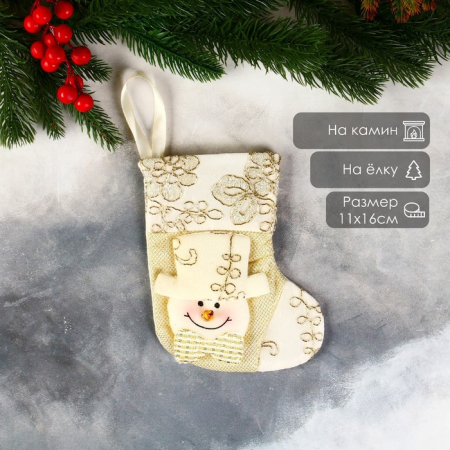 Золотистый текстильный носок с изображением снеговика сочетает в себе черты ар-деко, классики, датского дизайна и шебби-шика. Компактный размер 11x16 см делает его удобным для оформления новогоднего интерьера и упаковки небольших подарков.