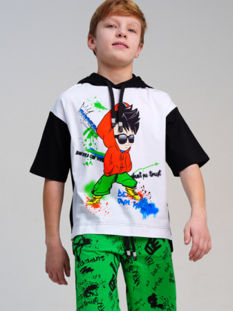 Футболка оверсайз для мальчика подростка. Капюшон с утяжкой шнурком. Высокое содержание хлопка. Благодаря наличию эластана в составе ткани изделие держит форму и меньше мнется. Модель выполнена из качественного и приятного на ощупь трикотажа.