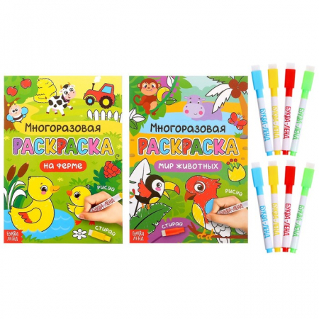 * Две раскраски с 12 многоразовыми страницами в каждой, идеально подходящие для творческих экспериментов.