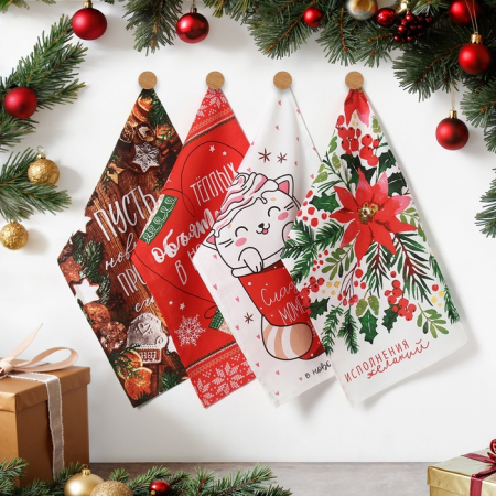 Набор новогодних кухонных полотенец Доляна «Новогоднее настроение» 35?60 см-4 штуки, 100% хлопок (арт. 7107741)