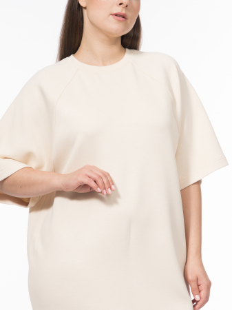 Платье, в котором комфорт встречается с универсальностью создано благодаря сочетанию полуспортивного стиля с актуальным дизайном. Выбрали для модели ткань, состоящую из рэйона, полиэстера и спандекса, такое трикотажное полотно объединяет в себе мягкость и легкость рэйона, износостойкость полиэстера и эластичность спандекса, обеспечивает идеальную посадку по фигуре, свободу движений и комфорт в течение всего дня. Рэйон, напоминающий по свойствам хлопок и шелк, гарантирует приятные тактильные ощущения и воздухопроницаемость, полиэстер сохраняет форму изделия, а спандекс делает платье удобным и практичным. Молочный оттенок «античный белый» создает актуальный образ, делая платье подходящим для повседневной носки, прогулок или неформальных встреч. Особенностью модели является крой с рукавом реглан, благодаря чему верх платья напоминает удобный лонгслив с характерным для него комфортным круглым вырезом. Такое платье универсальное решение для тех, кто ценит комфорт и утилитарный подход к повседневной моде.