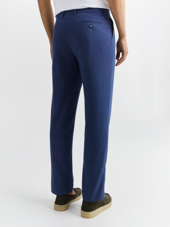 Базовые брюки в оттенке синий меланж выполнены из смесового материала на основе хлопка и льна с добавлением вискозы и полиэстра. Благодаря эластичным волокнам модель отлично держит форму и обеспечивает комфорт движений. Модель полуприлегающего силуэта с застежкой на пуговицу и вертикальными стрелками. Пояс со шлевками позволяет использовать ремень для дополнительной фиксации. В сочетании с пиджаком из этой коллекции создадут классический деловой образ.