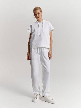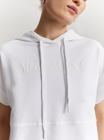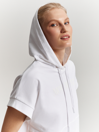Белый свитшот с коротким цельнокроеным рукавом выполнен из гладкого хлопкового трикотажа с плотным переплетением нитей. Капюшон на шнурке придает образу расслабленный и спортивный вид, а изящный принт в тон изделия - изюминку. Модель в универсальном белом цвете станет отличным дополнением к различным образам в стиле casual. Рекомендуем комбинировать с белыми брюками из коллекции.