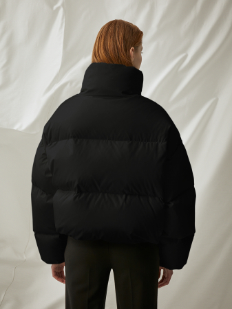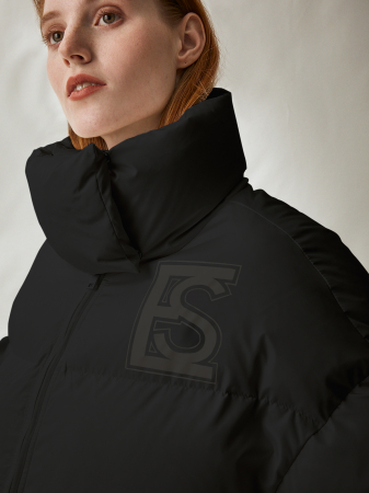 Демисезонный укороченный пуховик практичного чёрного цвета. Фирменная широкая простёжка гарантирует оптимальное распределение утеплителя. Прочный непродуваемый материал защитит от непогоды, а натуральные пух и перо обеспечат комфортную температуру. Модель прямого силуэта, увеличенного обёма, с центральной застёжкой на тесьму-молнию, боковыми карманами и авторским принтом в цвет изделию на груди. Кулиска по низу куртки обеспечит удобную посадку, а объёмный воротник-стойка на кнопках защитит шею от ветра. Трендовая модель отлично впишется в ваш базовый гардероб.