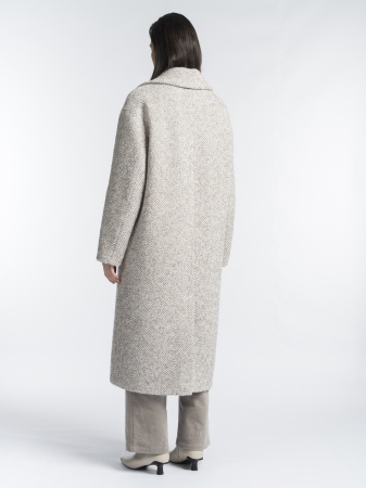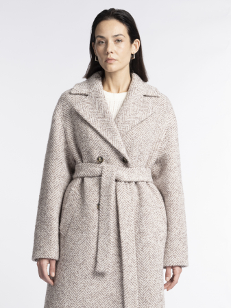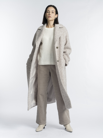 Классическое переплетение «ёлочка» в бежево-белой гамме делает пальто универсальным. Его можно носить с платьями и юбками практически любой длины, брюками или джинсами для офиса, прогулок или повседневных образов.