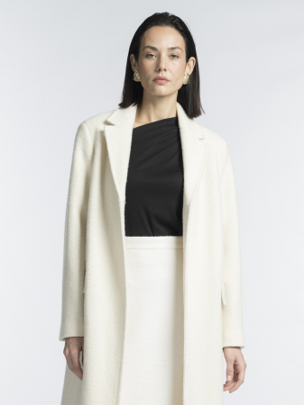 Ткань с текстурой букле придает модели особый шарм, а поливискозная подкладка добавляет комфорта и долговечности. Пальто с аккуратным отложным воротником и лацканами застегивается на незаметные кнопки, чтобы подчеркнуть фактуру ткани.