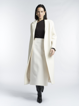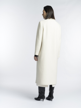 Однобортное пальто классического кроя сшито из шерстяной ткани-букле в нежном молочном оттенке. Тёплое, уютное и универсальное — оно подойдет как для повседневной носки, так и для парадного выхода.
