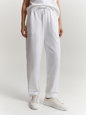 Однотонные спортивные джоггеры белого цвета выполнены из мягкого хлопкового трикотажа, который слегка тянется и не сковывает движений. Модель прямого силуэта с комфортным эластичным поясом и крупными накладными карманами спереди. Свободный крой обеспечивает удобную посадку на любой тип фигуры. Низ изделия оформлен резинкой и декорирован разрезами с тесьмой-молнией, что позволяет изменять ширину брюк для большего комфорта и удобства. В сочетании с футболками из коллекции создадут расслабленные образы на каждый день.