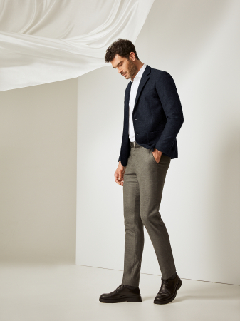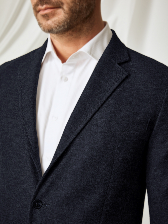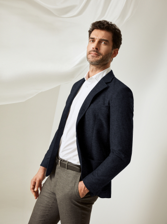 Актуальный пиджак из плотной турецкой ткани тёмно-синего оттенка с меланжем. Особое переплетение нитей не позволяет изделию деформироваться со временем, дышащая вискоза делает его мягким и приятным к телу, эластичные волокна обеспечивают удобную, не сковывающую движений посадку. Модель с отложным воротником с лацканами, однобортной застёжкой на пуговицы в тон изделию, накладными карманами спереди и карманом с листочкой на груди. Пиджак в стиле смарт кэжуал можно дополнить поло и джинсами.