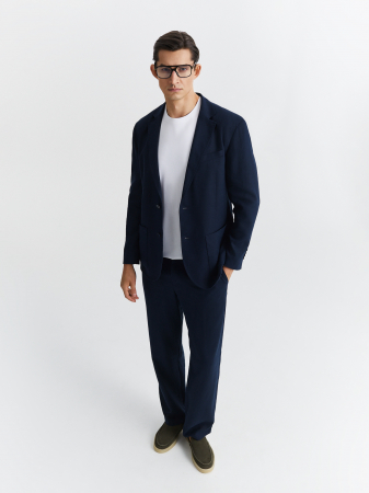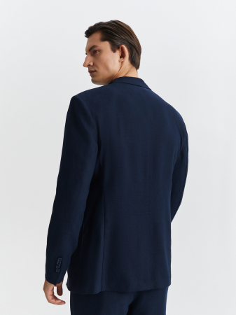 Темно-синий пиджак актуального прямого силуэта выполнен из приятного материала, в составе которого высококачественный тенсел и лен. Модель на частичной подкладке с застежкой на две пуговицы, накладными карманами, карманом с листочкой на груди и декоративной строчкой. Пиджак идеально сочетается с брюками из этой же ткани, однотонными рубашками и поло, позволяя собрать комфортный офисный образ для лета.