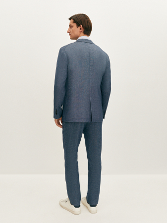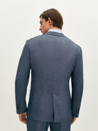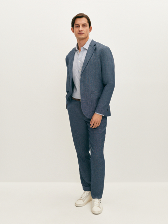 Стильный пиджак из синей меланжевой ткани полуприлегающего силуэта. Выполнен из смесовой ткани, в составе которой лен, вискоза, полиэстер и эластан. Легкий материал слегка тянется и позволяет комфортно сесть по фигуре. Изделие на частичной подкладке, что идеально подходит для весенне-летнего периода. Модель дополнена двумя накладными карманами и одной шлицей. Пиджак в клетку станет элегантным решением для вашего гардероба. Он гармонично дополнит брюки из комплекта, а также отлично завершит образ в стиле smart casual.
