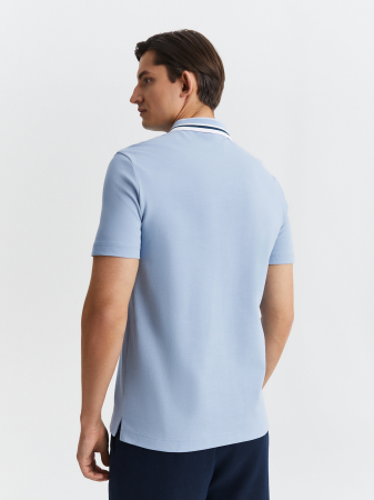 Поло светло-голубого оттенка прямого силуэта на основе дышащей ткани пике из натурального хлопка. Мягкий трикотаж не препятствует циркуляции воздуха и обеспечивает комфортную посадку на фигуре. Модель с коротким рукавом, отложным воротником и застежкой на две пуговицы дополнена контрастным воротником с декоративными полосками. Поло идеально подойдет для создания современных образов в стиле casual как для офиса, так и для активного отдыха.