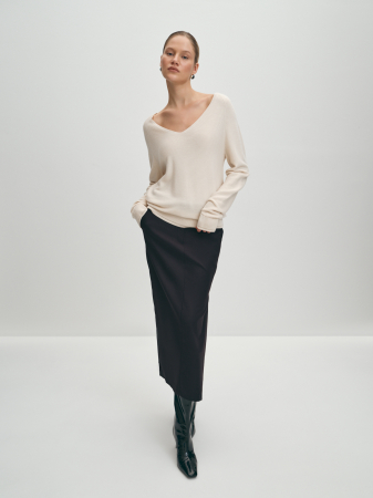 Вязаный, немного удлиненный пуловер фактурной вязки, напоминающей поперечную резинку, зайдет в гардероб как базовый. Аккуратный V-вырез можно слегка развести в стороны, сделав шире и эффектнее. Рукав реглан в цельновязаном изделии практически незаметен, добавляет небольшой акцент. Если подобрать размер на один-два больше обычного, можно сформировать силуэт оверсайз, он предполагает ношение вещей большого размера, это удобно и стильно. Пряжа из модифицированной вискозы тактильно приятна и, при правильном уходе, джемпер будет радовать не один и не два сезона. Очень светлый, почти молочный оттенок сочетается с любыми цветами и принтами. Джемпер подойдет для офиса, школы,прогулки, встречи с друзьями.