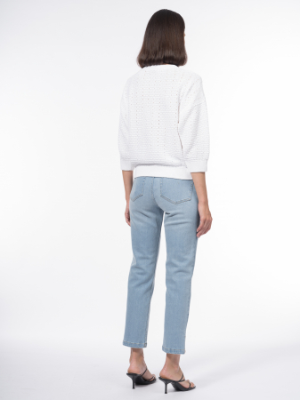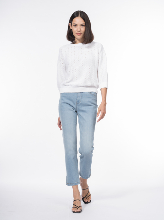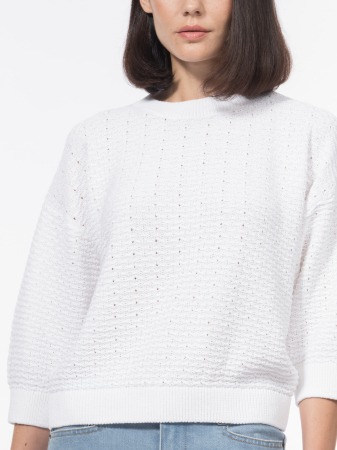 Джемпер особой вязки, выполненный из итальянской пряжи, полностью состоящей из натурального хлопка, представляет собой идеальное сочетание стиля и комфорта. Хлопок, используемый в этой модели, обладает гипоаллергенными свойствами, что делает его безопасным для чувствительной кожи, а также обеспечивает отличную воздухопроницаемость, позволяя коже дышать. Одной из ключевых особенностей этого джемпера является авторское переплетение нитей, разработанное специалистами Компании. Этот уникальный фантазийный ажур придаёт модели легкость и воздушность, что делает её идеальной для носки в тёплую погоду, вплоть до уверенной плюсовой температуры. Такой подход к дизайну не только добавляет визуального интереса, но и создает ощущение невесомости, делает джемпер особенно привлекательным. Горловина, низ изделия и манжеты укороченных рукавов связаны резинкой, что обеспечивает удобство и комфорт при носке. Резинка помогает сохранить форму изделия, предотвращая его растягивание и деформацию. Укороченные рукава добавляют современный штрих и делают джемпер более универсальным, позволяя легко сочетать его с различными предметами гардероба. Все детали джемпера были вывязаны точно по лекалу на японской плосковязальной машине Shima Seiki, что гарантирует высокое качество и долговечность. Эта технология позволяет достичь идеальной точности в вязании, что особенно важно для создания сложных узоров и текстур. Соединительные швы выполнены на кеттельном оборудовании, что является признаком премиального подхода к производству. Эта дорогая обработка обеспечивает эластичное и практически незаметное соединение, что делает джемпер ещё более комфортным в носке и не стесняет движений. Все детали джемпера были вывязаны точно по лекалу на японской плосковязальной машине Shima Seiki, что гарантирует высокое качество и долговечность. Эта технология позволяет достичь идеальной точности в вязании, что особенно важно для создания сложных узоров и текстур. Соединительные швы выполнены на кеттельном оборудовании, что является признаком премиального подхода к производству. Такая сложная, с высокой долей ручного труда, обработка обеспечивает эластичное и практически незаметное соединение, что делает джемпер ещё более комфортным в носке и не стесняет движений. Таким образом, джемпер особой вязки в актуальном белом цвете не только отражает современные модные тренды, но и является универсальным элементом гардероба, который легко комбинируется с различными предметами одежды. Он станет отличным выбором для создания стильных образов, добавляя в них нотку оригинальности и утонченности.