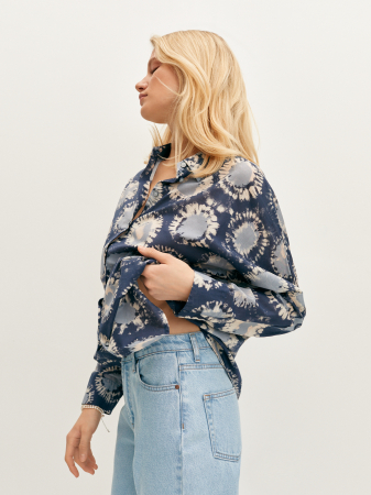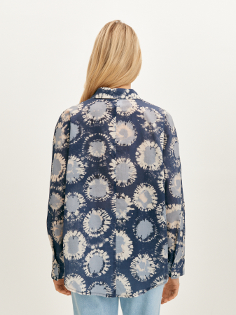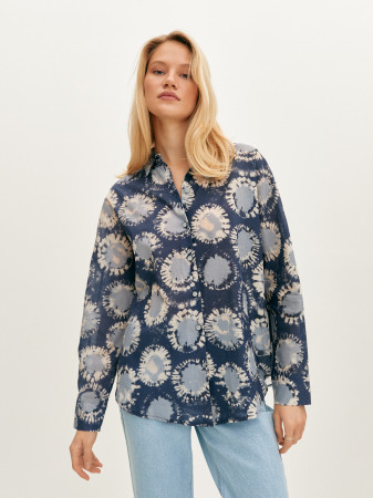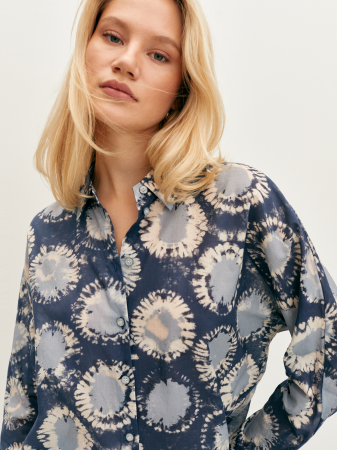 Стильная блуза с дизайнерским принтом сине-голубых оттенков в стиле тай-дай. Премиальная французская ткань из стопроцентного хлопка приятна на ощупь и почти не ощущается на теле. Модель прямого силуэта с длинным свободным рукавом и аккуратным манжетом. Для стильного образа блузку можно дополнить базовым топом и джинсами, а для создания весеннего тотал-лука мы рекомендуем комбинировать блузку с принтованной юбкой из нашей коллеции.