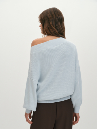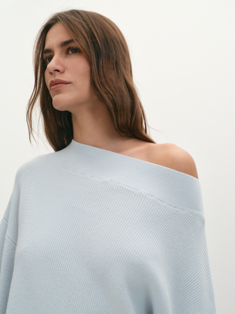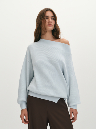 Джемпер силуэта оверсайз, выполненный из итальянской хлопковой пряжи, представляет собой идеальное сочетание комфорта и стиля. Эта модель отличается фактурным переплетением полуфанг, известным также как «английская резинка», что придаёт изделию уникальную текстуру и визуальный интерес. Джемпер имеет элегантный вырез-лодочку, который подчеркивает линию шеи и добавляет образу женственности. Длинные втачные рукава, наполненные и свободные, создают ощущение легкости и непринужденности, что делает его идеальным для повседневной носки. Горловина, низ изделия и манжеты связаны резинкой, что обеспечивает удобство и комфорт при носке, а также помогает сохранить форму изделия. Особенностью данной модели является разрез по низу, выполненный на резинке, который добавляет динамичности и позволяет варьировать стиль. Джемпер можно носить как симметрично, так и открыв одно плечо, что делает его универсальным элементом гардероба. Все детали джемпера были вывязаны точно по лекалу на японской плосковязальной машине Shima Seiki, это гарантирует высокое качество и долговечность. Такая технология позволяет достичь идеальной точности в вязании, что особенно важно для создания сложных узоров и текстур. Соединительные швы выполнены на кеттельном оборудовании, это премиальный подход к производству. Такая сложная, с высокой долей ручного труда, обработка обеспечивает эластичное и практически незаметное соединение, что делает джемпер ещё более комфортным в носке и не стесняет движений. Таким образом, джемпер оверсайз из итальянской хлопковой пряжи не только отражает актуальные модные тренды, но и является универсальным элементом гардероба, который легко комбинируется с различными предметами одежды. Модель в нежном бледно-голубом цвете станет отличным выбором для создания стильных образов, добавляя в них нотку оригинальности и утонченности.