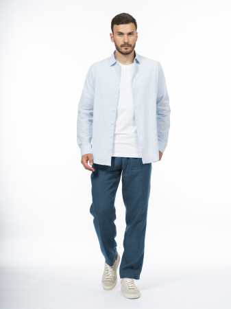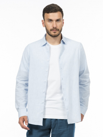 Модель лаконичного дизайна характеризуется традиционными для классической рубашки деталями. Прямой крой обеспечивает комфорт в движении и универсальность. Отложной воротник на отрезной стойке дисциплинирует образ и расширяет стилистические возможности, позволяя с легкостью трансформировать лук от офисного варианта до расслабленного городского образа просто расстегнув верхние пуговицы и закатав рукава. Узкая кокетка на спине обеспечивает правильную посадку по плечам. Закругленный низ не топорщится при заправке в брюки. Качественный дуэт хлопка и льна отвечает за комфорт: хлопок обеспечивает мягкость и гипоаллергенность, а лен добавляет благородную фактуру и уникальную способность к терморегуляции. Такая ткань создана для того, чтобы кожа дышала, оставаясь при этом сухой, несмотря на жаркую погоду. Выбрали для рубашки комфортного силуэта regular премиальную меланжевую ткань производства Турции. Меланжевый серо-голубой – свежий и непринужденный цвет, который придает образу легкость и динамику. Он универсален для городской повседневности, отпуска или прогулок.