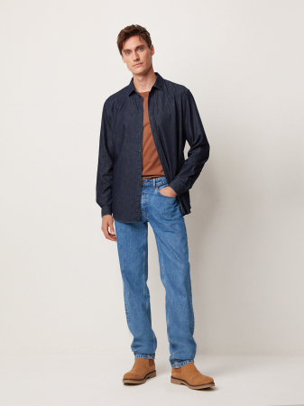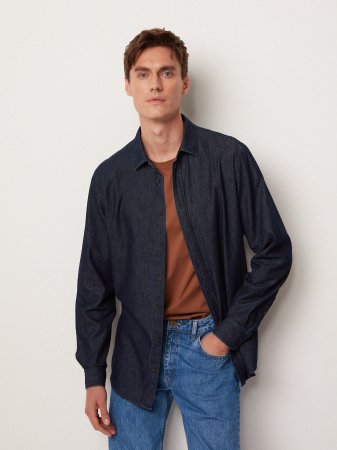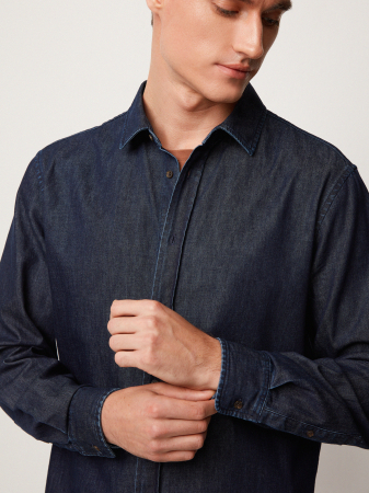 Повседневная рубашка сдержанного синего оттенка выполнена из хлопкового денима. Прочный натуральный материал слегка тянется, обеспечивая не сковывающую движения посадку. Модель полуприлегающего силуэта, со стояче-отложным воротником, центральной застёжкой на планку с пуговицами в тон изделию и длинным втачным рукавом с манжетом на пуговице. Комфортная рубашка дополнит образ в стиле кэжуал.