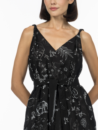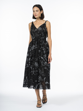 Фантазийный принт в монохроме – необычное, запоминающееся решение для летнего платья. Расцветка платья создает сдержанный и элегантный образ. Черный фон добавляет образу глубины и универсальности, а уникальный романтичный принт, созданный с помощью нанесения белого контура и вытравления элементов, привлекает внимание. Белый контур и полупрозрачные детали создают интересный эффект объема, усиливающийся благодаря белой подкладке модели. Обычно скрытая деталь, на этот раз является полноправным участником образа. Основная ткань модели вискозная, тонкая и невесомая. Вискоза обеспечивает легкость и демонстрирует высокое тактильное качество, а полиэстер добавляет необходимую прочность и позволяет создать уникальный рисунок с помощью современного метода травления. Хлопковая подкладка обеспечивает комфорт, улучшает посадку и добавляет изделию долговечность. Прозрачные изображения, являющиеся частью рисунка, отражают стремление дизайнеров следовать модным тенденциям, а тонкая ткань на основе вискозных волокон и хлопковая подкладка подарят комфорт жарким летом. Ткани мягко обрисовывают фигуру, создавая плавные линии и подчеркивая изящный силуэт. Крой платья подчеркивает его принадлежность к романтичному стилю: А-силуэт создает аккуратный и сбалансированный силуэт, который гарантирует посадку для любого типа фигуры. Он добавляет образу легкости и то же время динамичности. Двойные перекруты на бретелях привлекают внимание, делая платье актуальным и современным. Широкий V-вырез визуально удлиняет шею и подчеркивает хрупкость образа, а пояс из основной ткани обеспечивает удобную посадку, подчеркивая талию. Основная ткань платья А-силуэта привлекательно драпируется, что только подчеркивает романтичный характер модели.