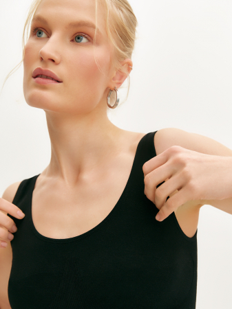 Спортивный топ-бра в черном цвете из натуральной вискозы. Модель комфортно облегает фигуру и тянется, не стесняя движений. Эластичный пояс и широкие бретели обеспечивают комфортную посадку по фигуре, а прилегающий силуэт делает ваш образ женственным и элегантным. Рекомендуется комбинировать с шортами и легинсами из нашей коллекции.
