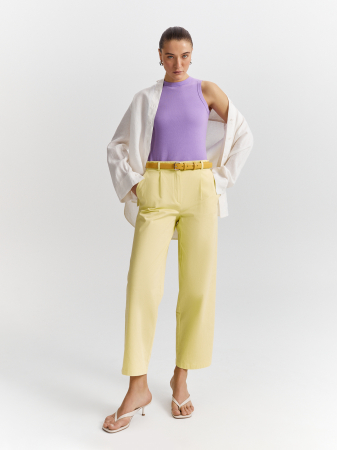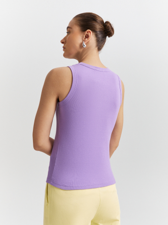 Трикотажный топ сиреневого цвета с американской проймой. Гладкий вискозный трикотаж приятен на ощупь и не деформируется со временем. Лаконичный дизайн, классический цвет и комфортный крой открывают широкие возможности для сочетаний. Топ легко станет базовой вещью в гардеробе и дополнит как современный деловой образ, так и look в стиле smart casual.