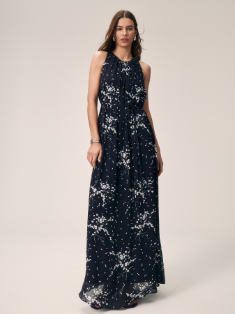 Платье выполнено в стиле "романтический кэжуал". Флоральный принт и шифон делают модель воздушной. Вневременной дизайн с полностью открытыми руками и длиной макси универсален для летнего периода. Вискозный шифон обеспечивает легкость, мягкость, воздухопроницаемость и приятные тактильные ощущения. Для маскировки прозрачности шифона модель дополнена тонкой подкладкой, обеспечивающей комфортную посадку. Платье в универсальном черном цвете создает сдержанный и изысканный образ, а флоральный принт, являющийся лейтмотивом капсулы, делает его актуальным в новом сезоне.