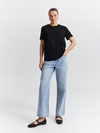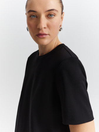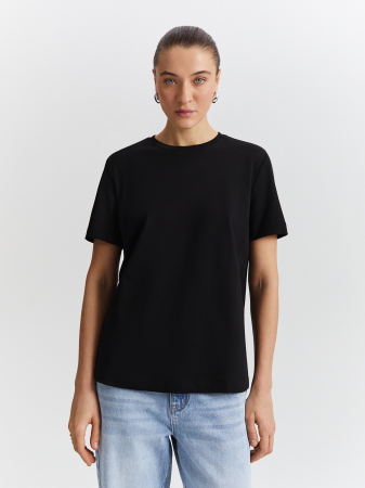 Базовая черная футболка выполнена из трикотажа на основе премиального хлопка. Материал хорошо пропускает воздух, держит форму и не вытягивается со временем. Модель прямого силуэта с коротким рукавом комфортно сидит по фигуре, а за счет светлого тона освежает образ. Актуальная футболка легко вписывается в гардероб, как самостоятельная модель, так и как первый слой для создания многослойных луков.